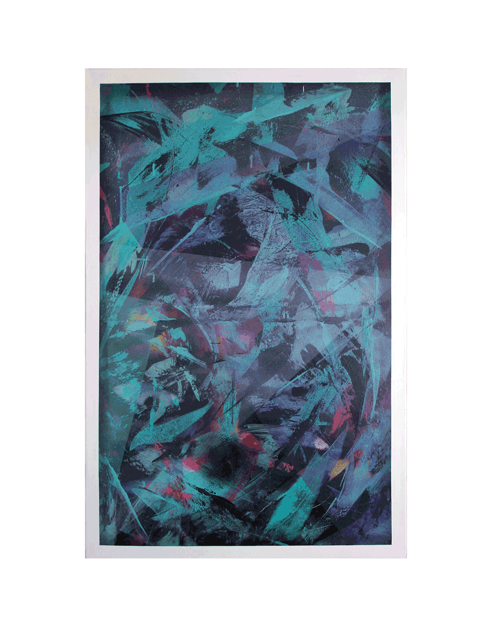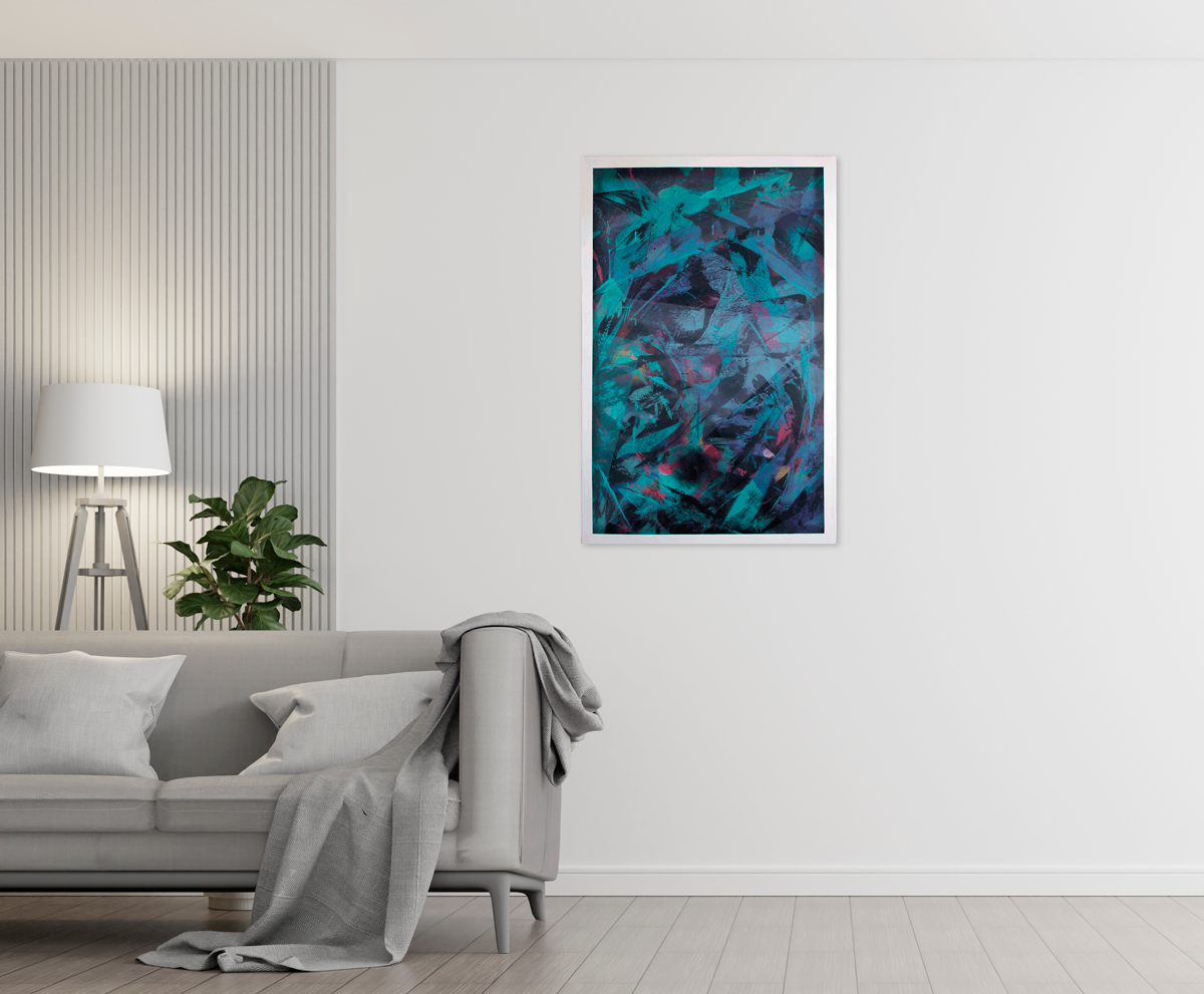 Abstraktes Unikat in dunklem Blau und Türkis, belebt durch lebendige pinke Akzente. Das mosaikartige Geflecht der Komposition zieht den Blick in komplexe, sich überlagernde Strukturen, die eine geheimnisvolle Tiefenwirkung erzeugen. In diesem facettenreichen Spiel aus Formen und Farbtönen verbirgt sich ein Mann mit Brille, der sich erst beim genauen Hinsehen offenbart. Das Werk entfaltet so eine subtile Spannung zwischen Ordnung und Überraschung und wird zu einem ausdrucksstarken Blickfang, der Räume mit rätselhafter Energie erfüllt.